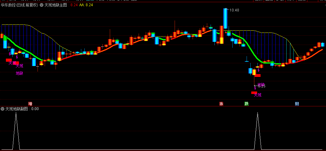 主图的两个信号,一个是“天残”,一个是“地缺”,之所以用这两个信号,也是因为这两个信号出现的时候,主图的两条趋势线中间链接的垂直线,整体看上去像一把魔琴,周星驰电影《功夫》里弹奏魔琴的是两个高手,天残和地缺,所以本套指标就取名天残地缺;
