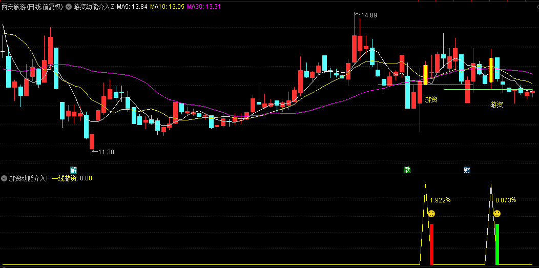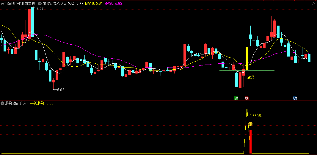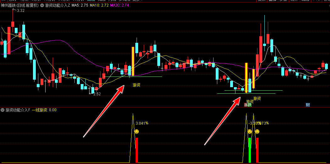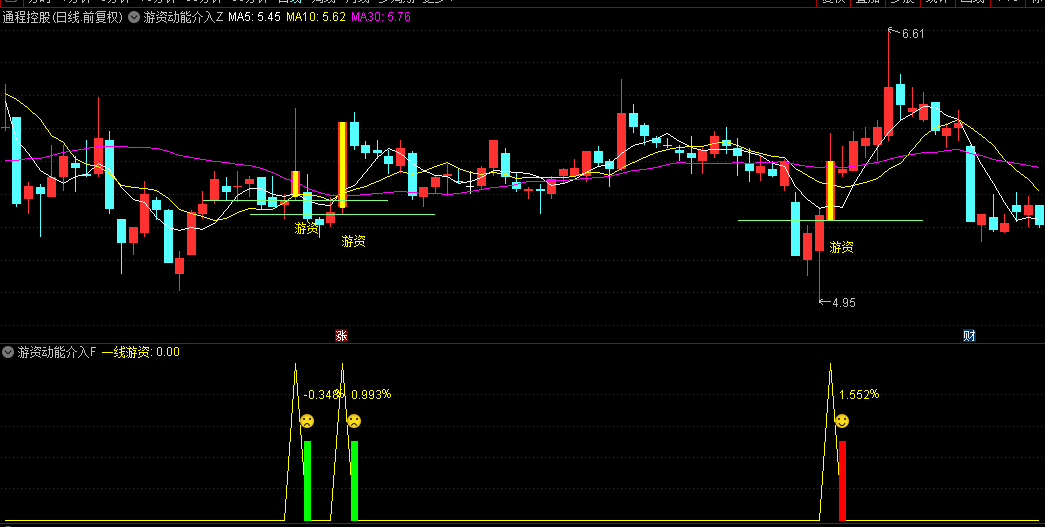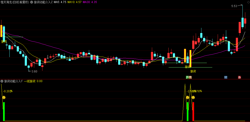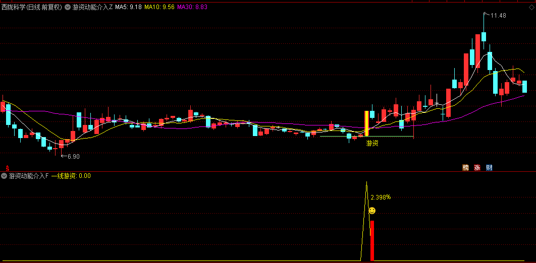 主图动态捕捉:通过明黄色K线标记游资介入信号,实时标注"游资"提示文字。