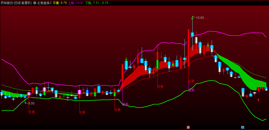 1.必涨红标:当价格突破5日均价通道且形成"阳包阴"结构时,在低点标注红色买入信号。