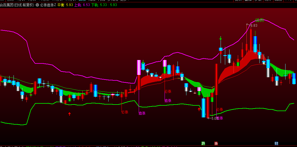 2.追涨紫标:识别放量暴涨,单日涨幅>5%且非长上影,标注于K线下沿。