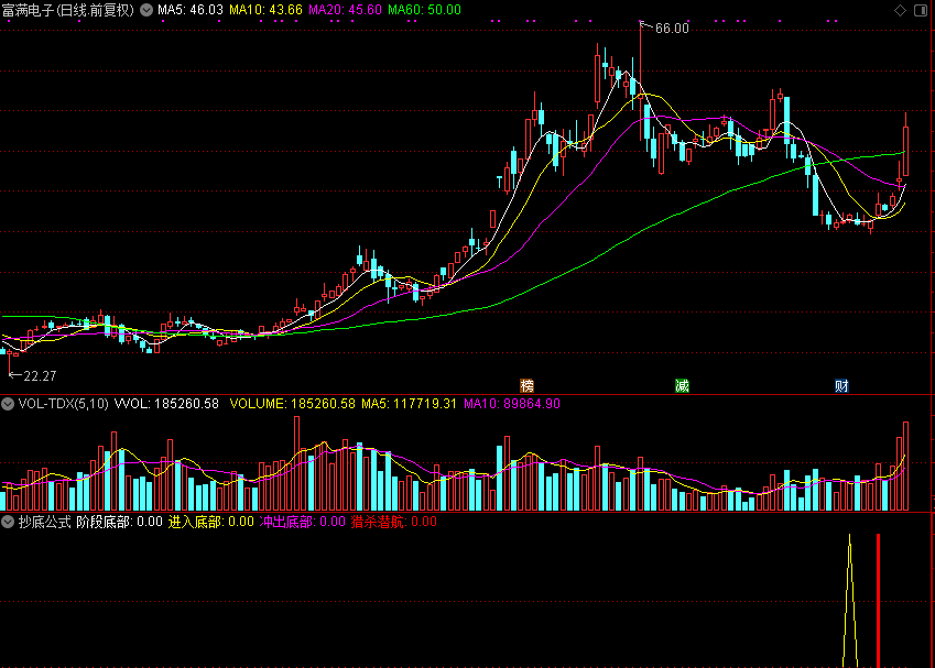 冲出底部:IF(CROSS(趋势线,底部线),10,0);
