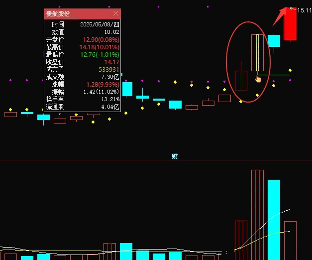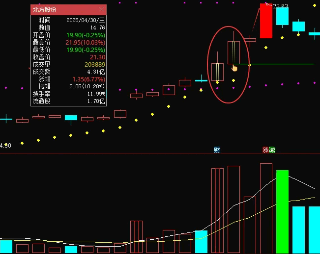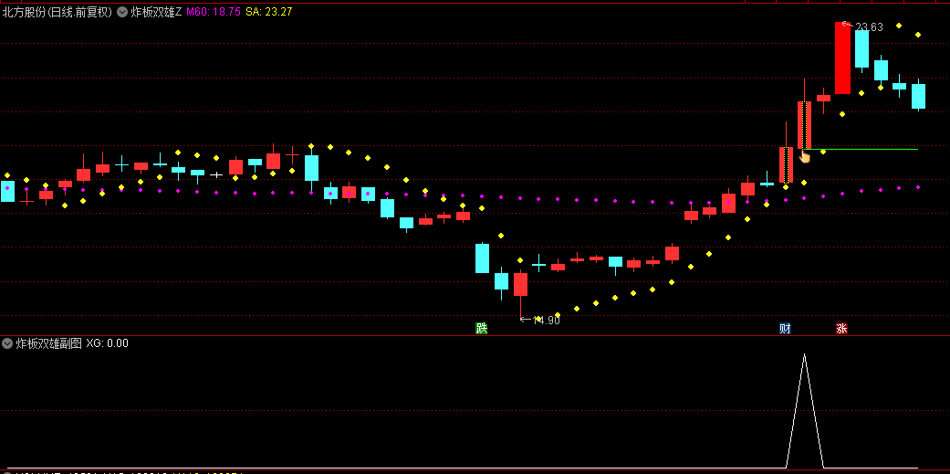 主图中的红色实体k线是涨停板,k线中间有黄色虚线的,是炸板k线;