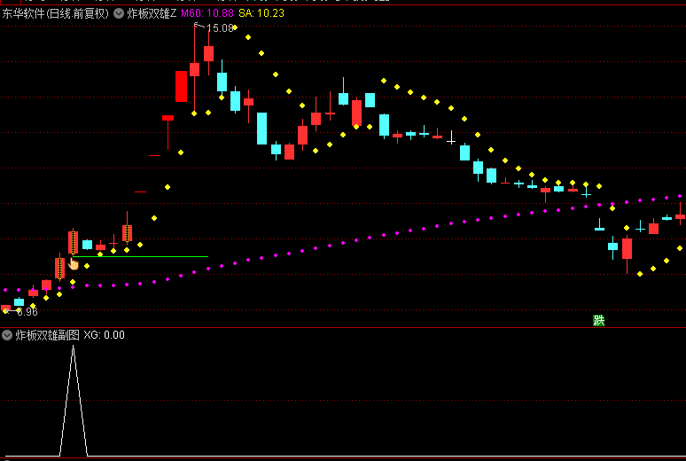 炸板双雄指的是连续两个炸板的阳线,注意两个细节,一个是连续,一个是阳线,也就是说,连续两天都是炸板,举个例子: