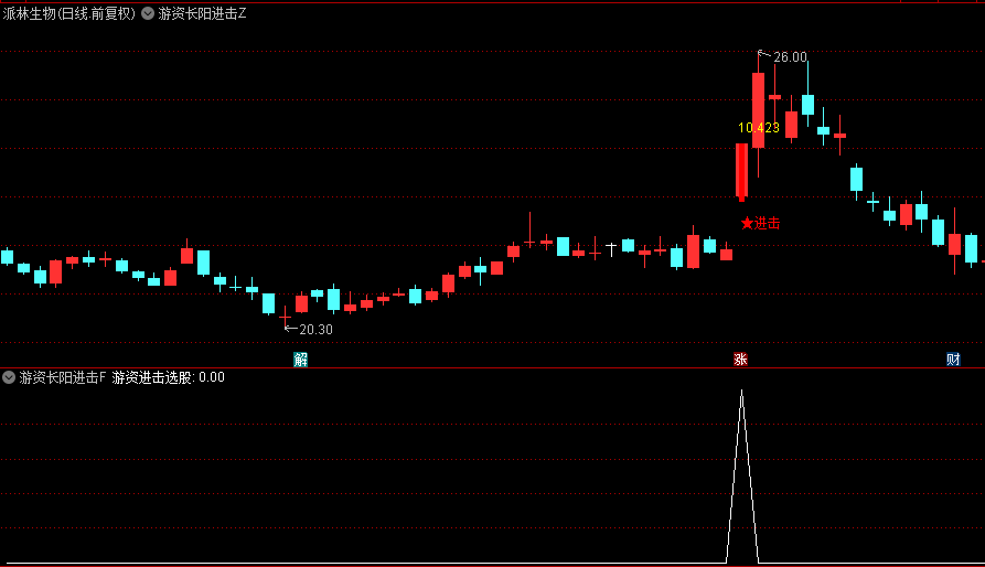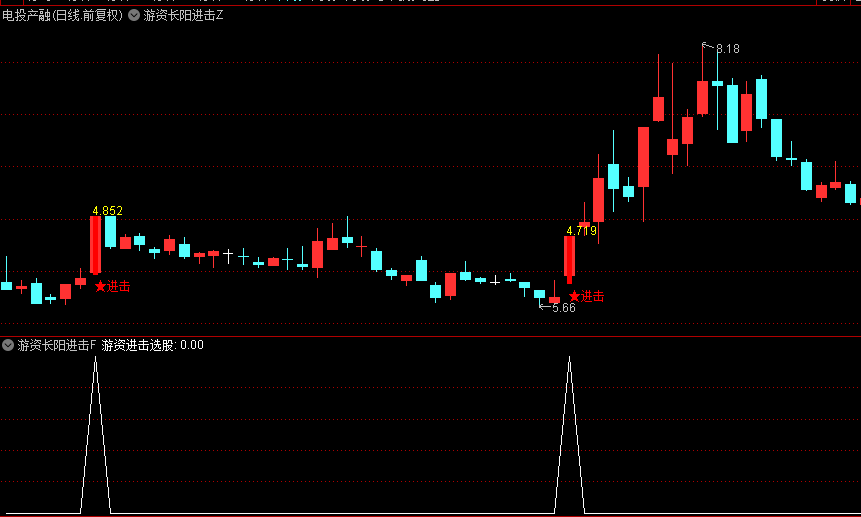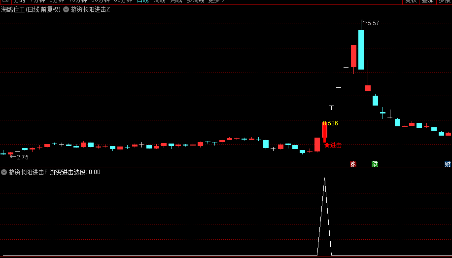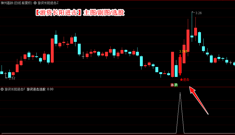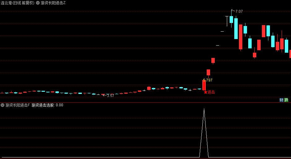 4.可视化标记:满足条件时在K线上显示红色柱状标记、红色"★进击"文字和黄色量比值。
