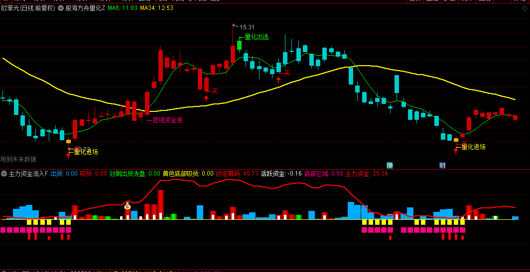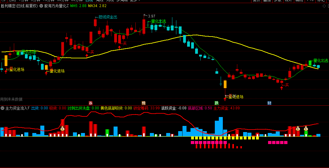 股海方舟量化进出场。两个指标,一个通达信【股海量化】主图指标,另一个通达信【主力资金流入】副图指标。