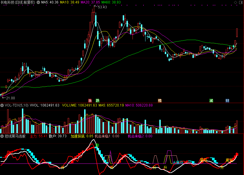 黑马线:=EMA(A11,5); A21:=(黑马线-REF(黑马线,1))/REF(黑马线,1)*100; A31:=EMA(C,5);