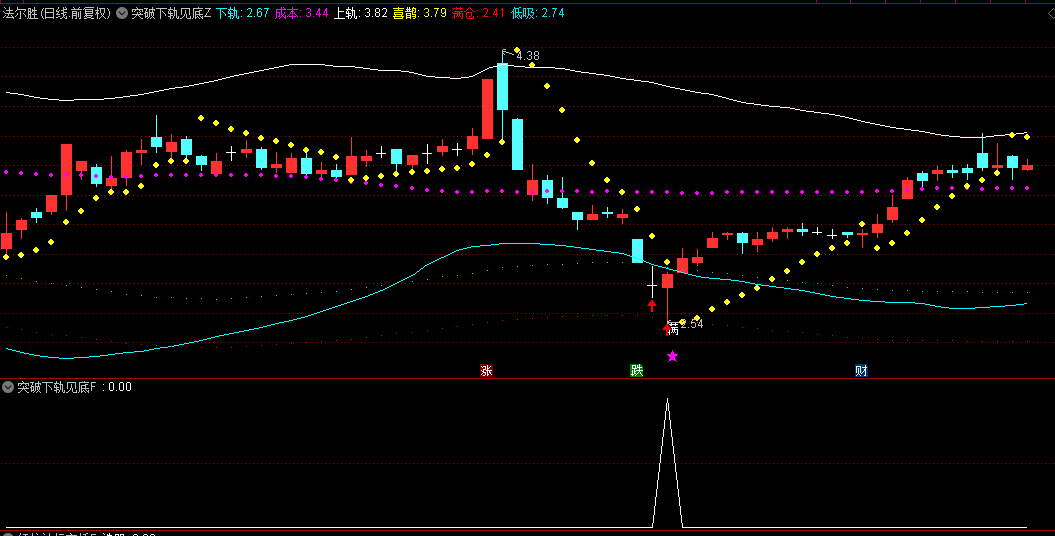 当价格触及红色虚线下方时,主图将自动显示红色上箭头并标注"满"字,提示底部确认。