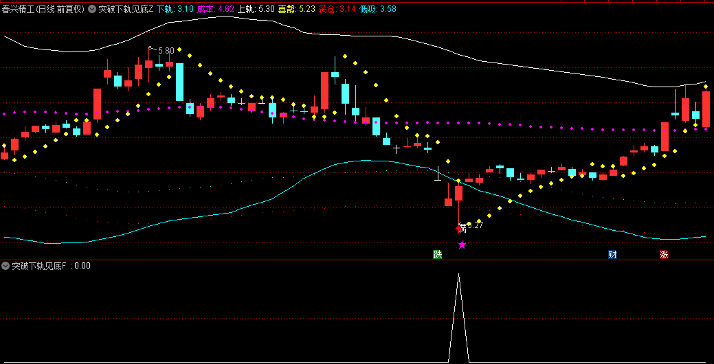 【突破下轨见底】主图/副图/选股指标,当黄色抛物线突破紫色分界线时,预示即将启动主升浪行情