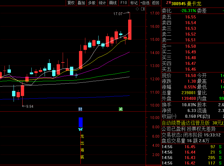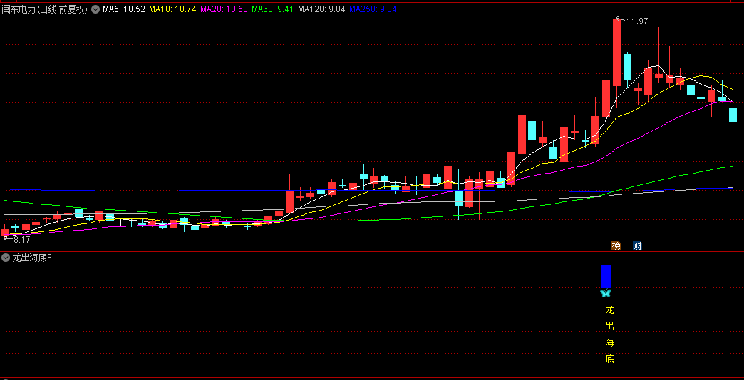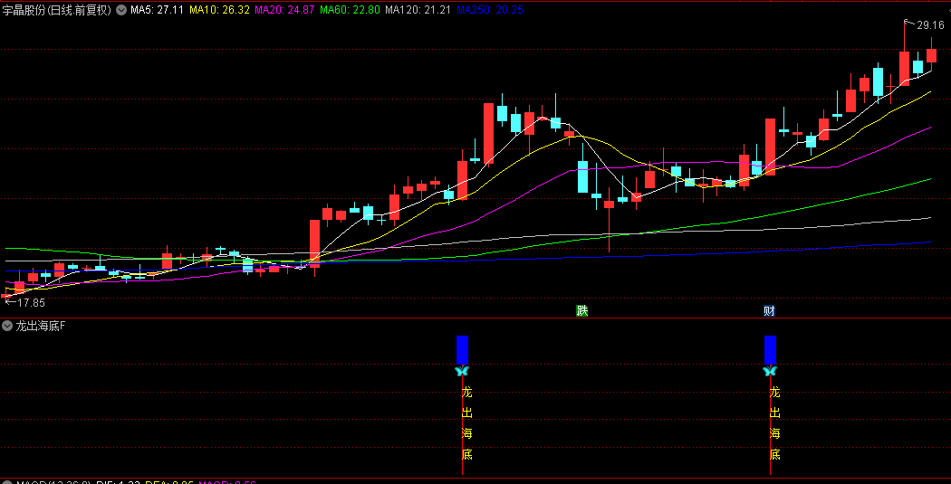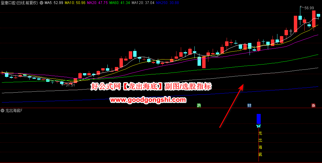 副图显示:以蓝色柱状和文字"龙出海底"直观标示买点。