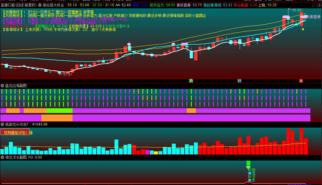 ①主图"妖股显身"信号+副图"盘龙出海"紫柱共振时,配合攻击量红柱确认买点。