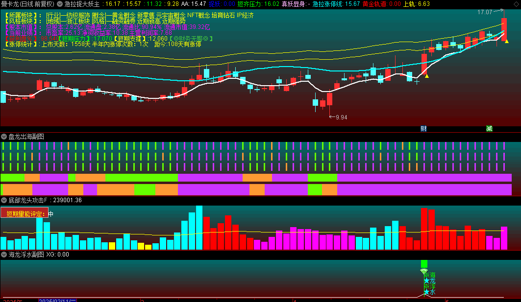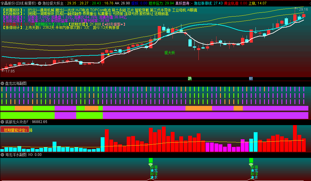 1.智能识别"妖股启动"信号:当白色操盘线上穿黄色压力带时触发"捉大妖"提示;