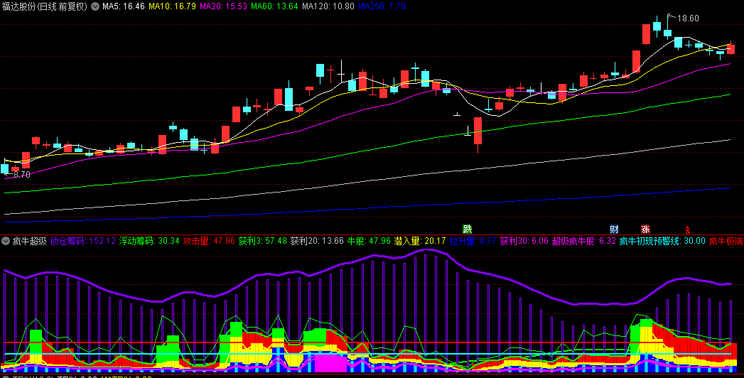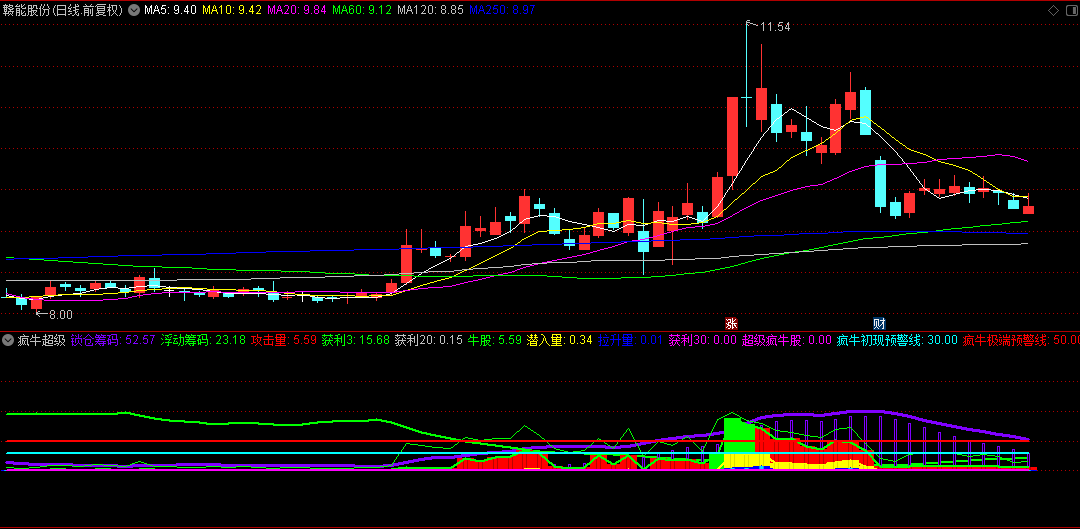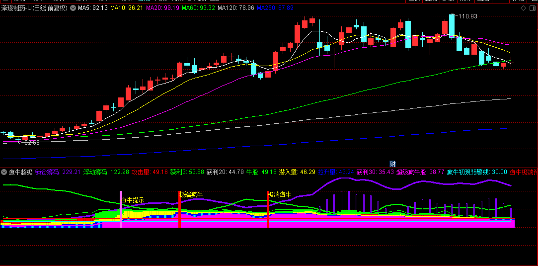 3.疯牛加速特征:紫色疯牛线突破50极端值,配合红色"极端疯牛"文字提示,往往对应主升浪。