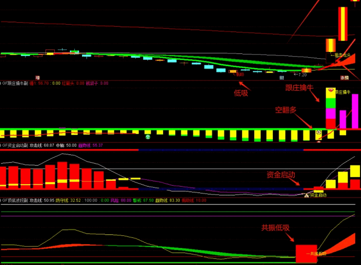 4、出现共振低吸信号为波段启动信号结合趋势线做判断成功率更高
