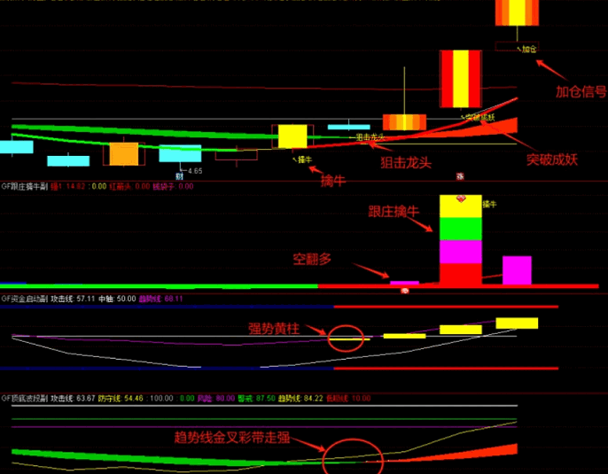 5、擒牛信号出现同时出现黄底K线,成功率更高,结合红绿彩带做趋势判断效果更好