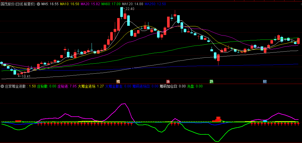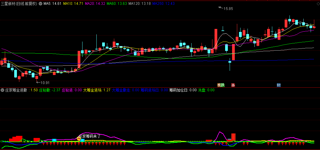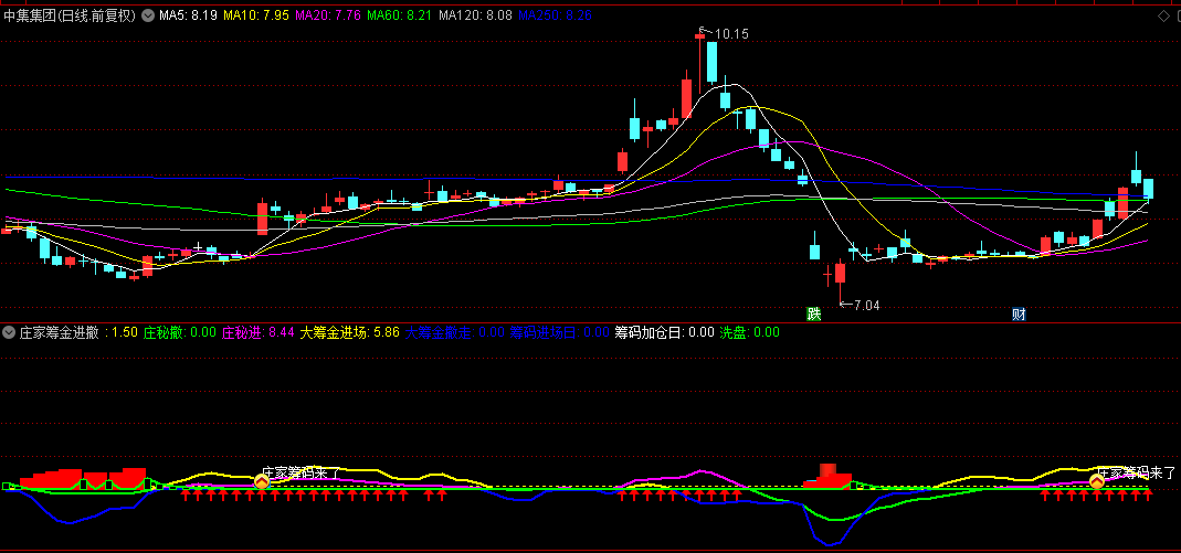通达信【庄家筹金进撤】副图指标,独创三色能量柱+筹码信号体系,直观展示庄家吸筹与撤离关键节点