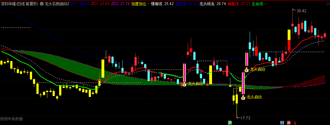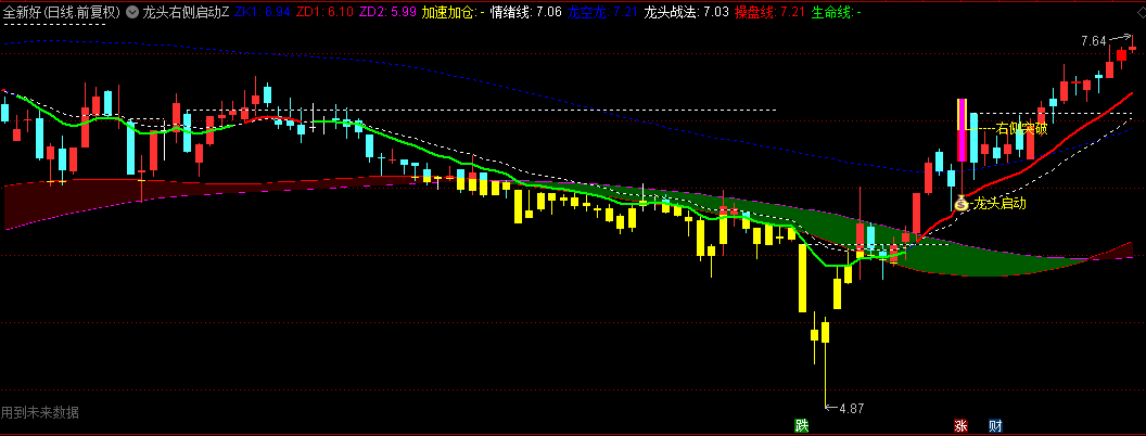 用法:当黄色柱线或“右侧突破”提示出现,且价格突破通道下轨(ZD1)时,配合“龙头启动”信号(紫色K线)可视为买点;红色操盘线上穿绿色生命线确认多头,加速加仓线提示趋势强化。适用于短线追涨龙头股,需结合K线站上通道及资金流入验证信号有效性。