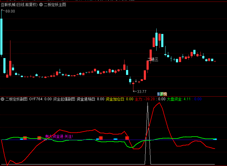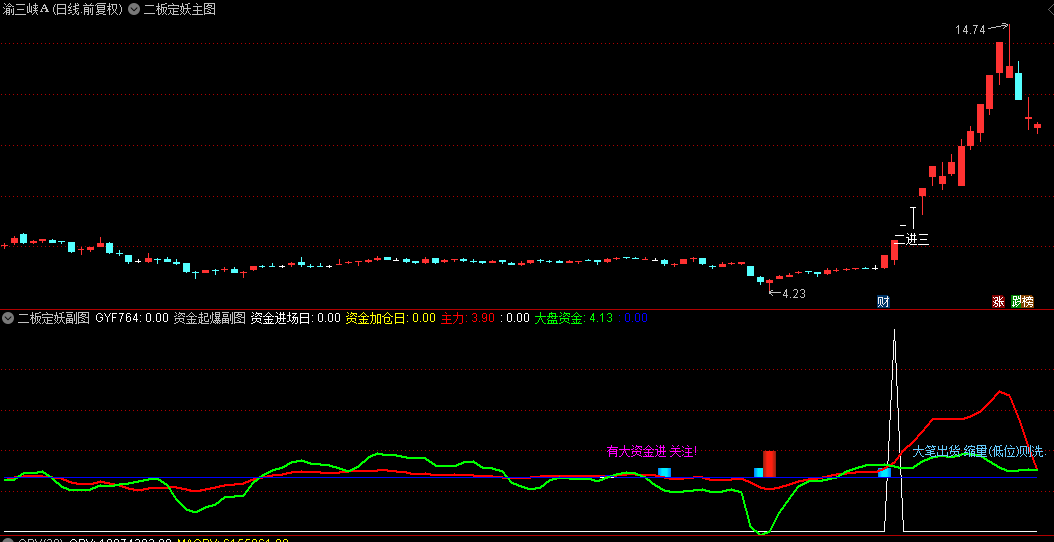 主图:动态标注"二进三"启动信号,结合三重EMA趋势线判断强弱。