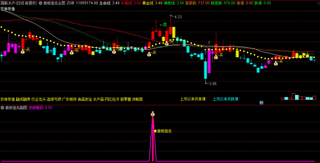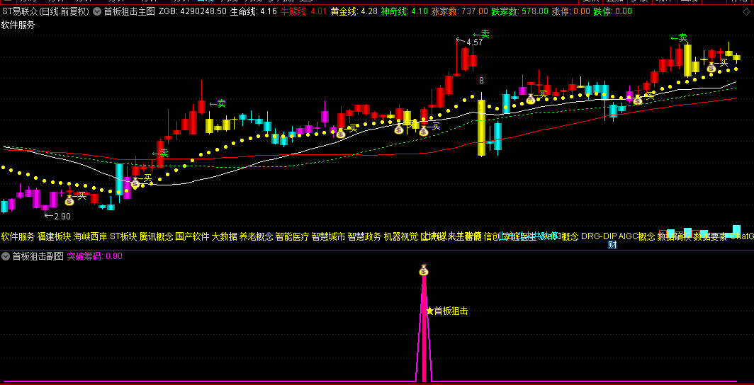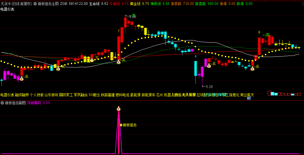 1.主图趋势定位:当K线由明黄转为玫红色,且突破黄金线时,结合副图"★首板狙击"信号,形成高胜率买点。