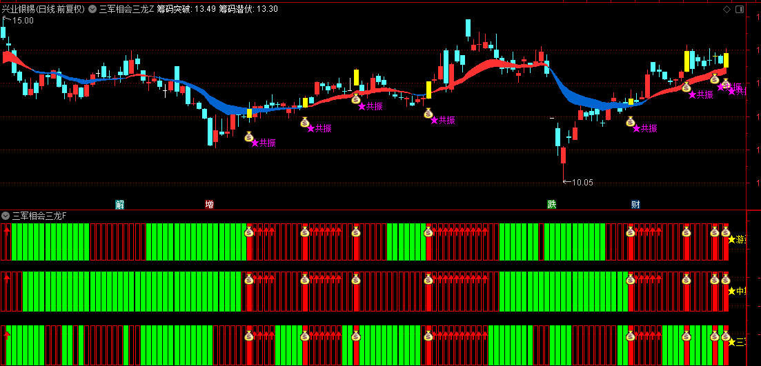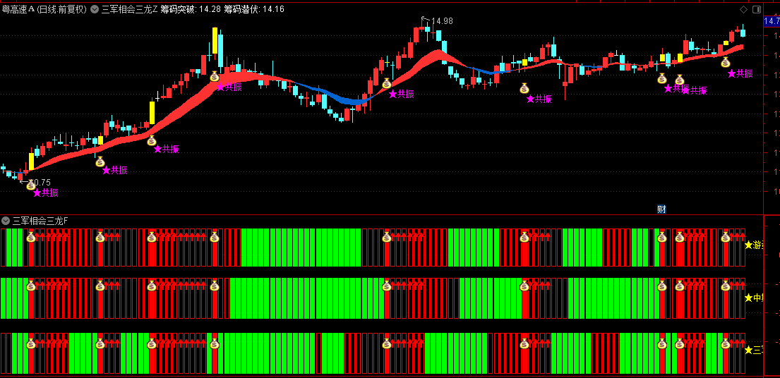 本套指标独创"三军共振"交易体系,通过游资、中期、短期三路资金动向的协同研判,精准捕捉主升浪启动点。