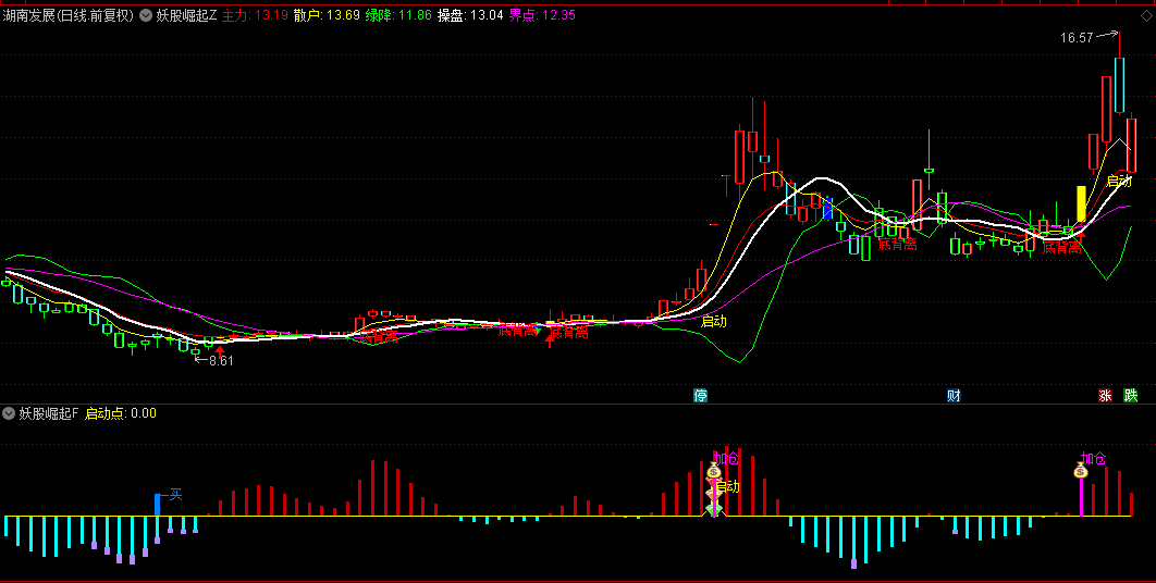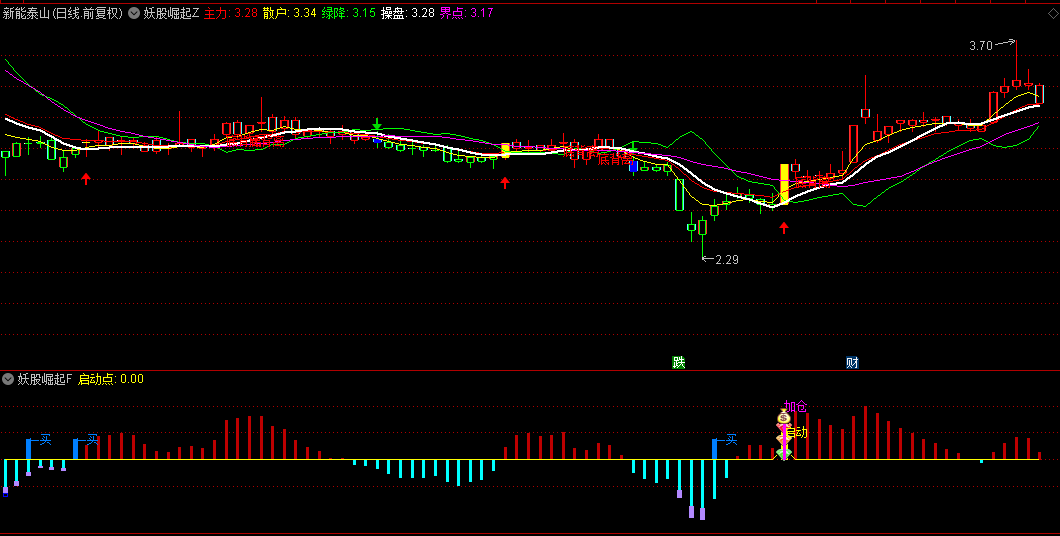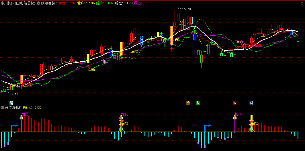 4.加仓触发器:量价齐升突破时紫色"加仓"信号;配合主图突破信号提高胜率。
