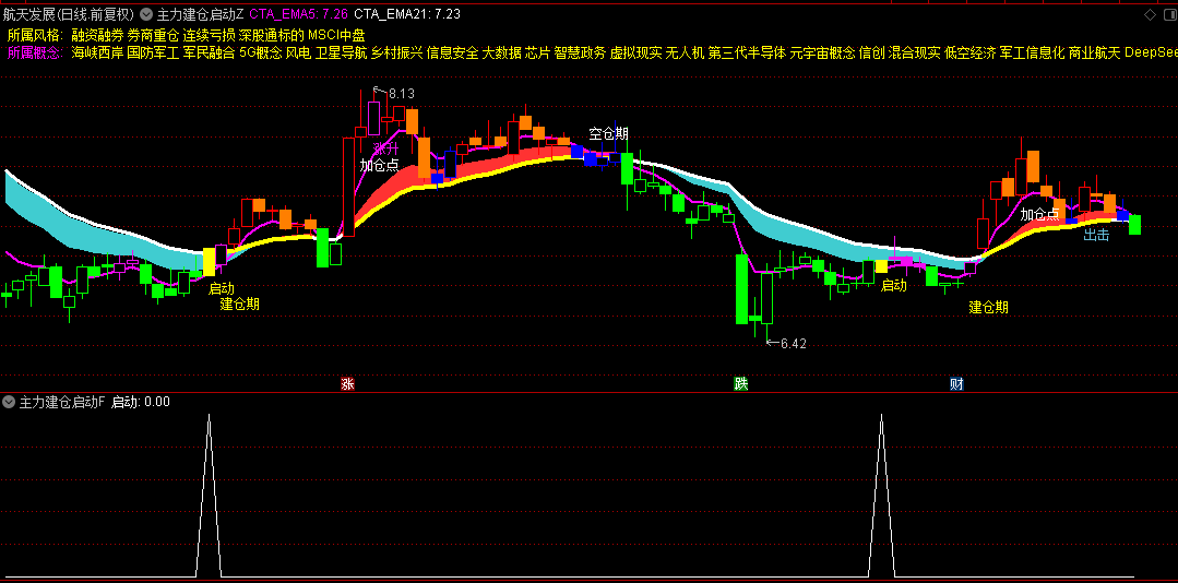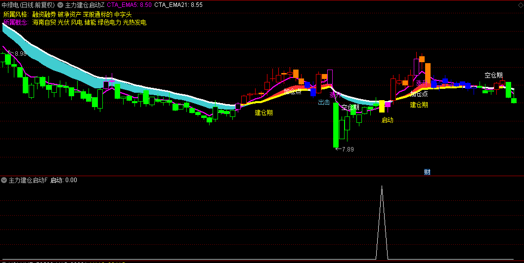 1.建仓期:当9日均线金叉20日均线时,显示黄色"建仓期"提示,配合量能放大可作为初步入场信号。