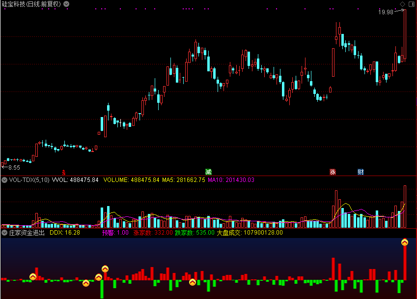 预警:DDX>0 AND MA(V,5)>MA(MA(V,5),5) AND CROSS(DDX1,DDX2),LINETHICK;
