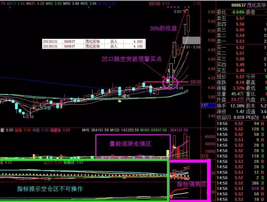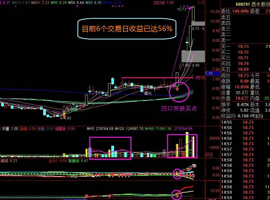 事实上,张老师的这句话,说得太谦逊了一点。在我们看来,凹口不仅是涨停板的虎腰猪喉,还是牛股冲天而去的牛栏口。只要牛股在牛栏内完成卧薪尝胆、养精蓄锐和厉兵秣马的大前提后,一旦破栏而出,必将冲空而去!