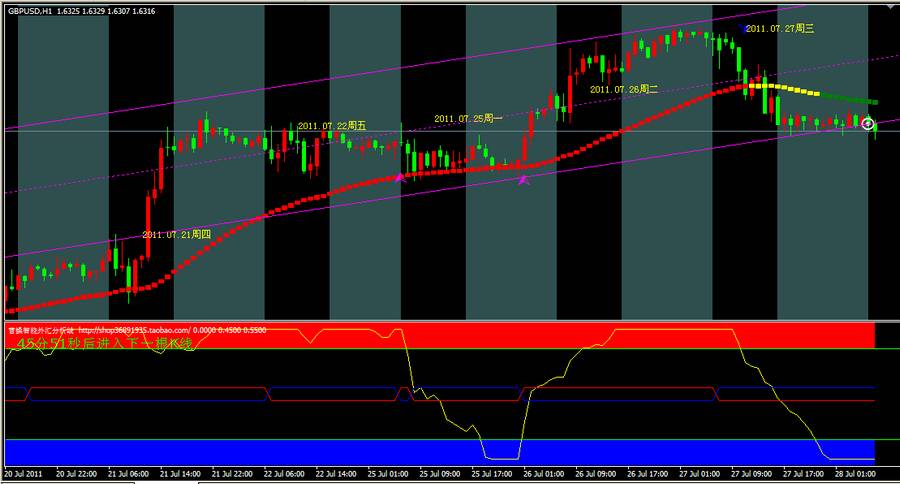 2、平仓:①行情达到40点平仓,留0.1手跟100点;如果0.1手向反向发展,接近到5个点前即平仓;②趋势线变色立即平仓,加0.1手待机再行下单开仓.