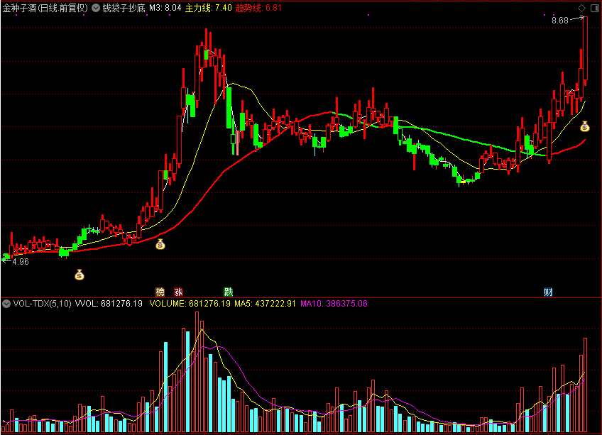 C2:=REF(C,1);A9:= DATETODAY(DATE);强:=V/REF(MA(V,5),1);JDZB:=强>135 AND 强<137;