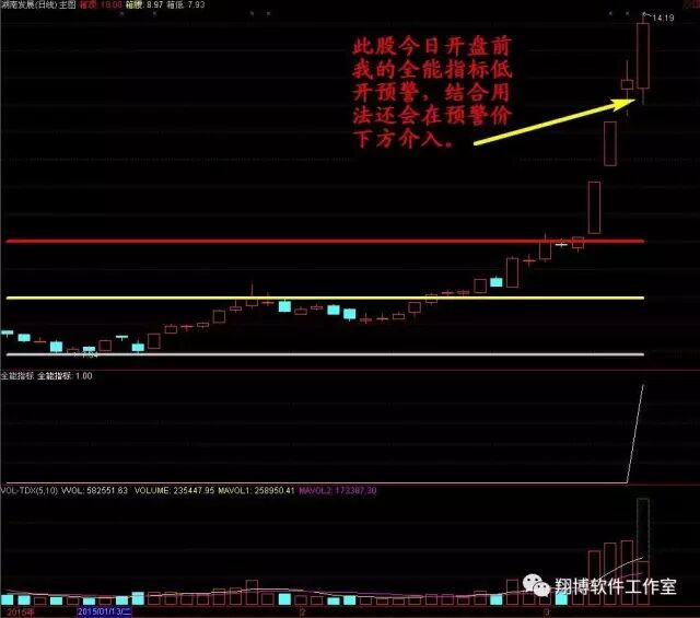 指标是结合了前两个交易日涨幅大于8个点的个股,前一个交易日跳空高开,收小阳为佳,当天股价低开,回落到2个点附近,结合了换手率,均线多头等条件。