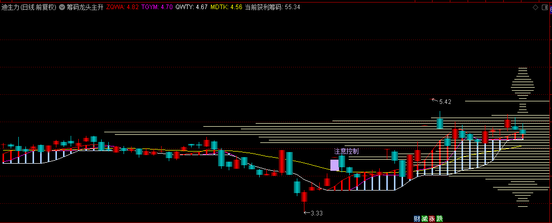 当出现突破信号时,在黄色均线位置标注"注意控制"警示。
