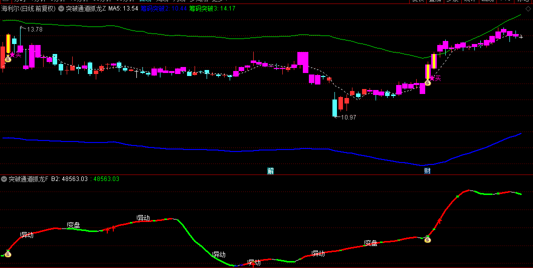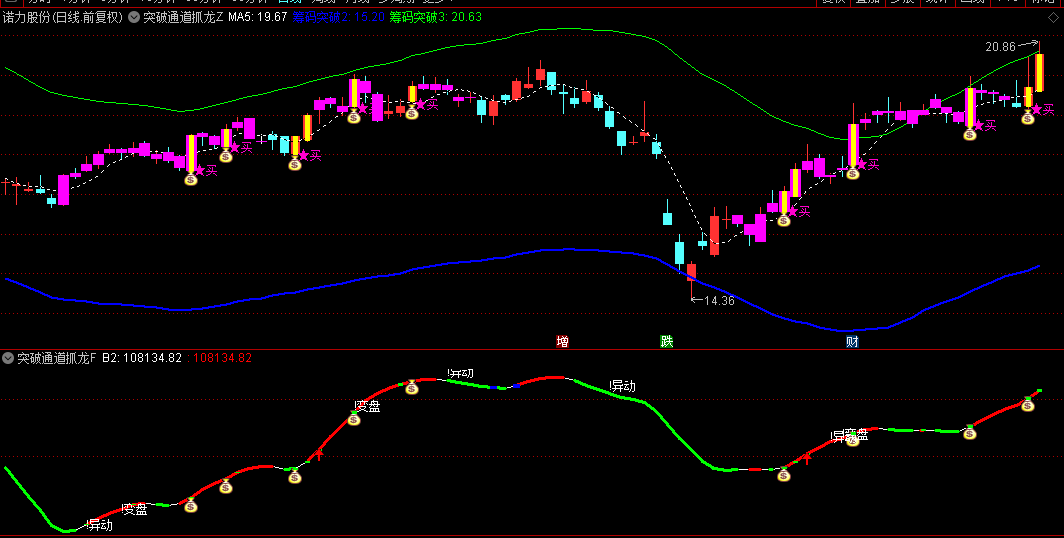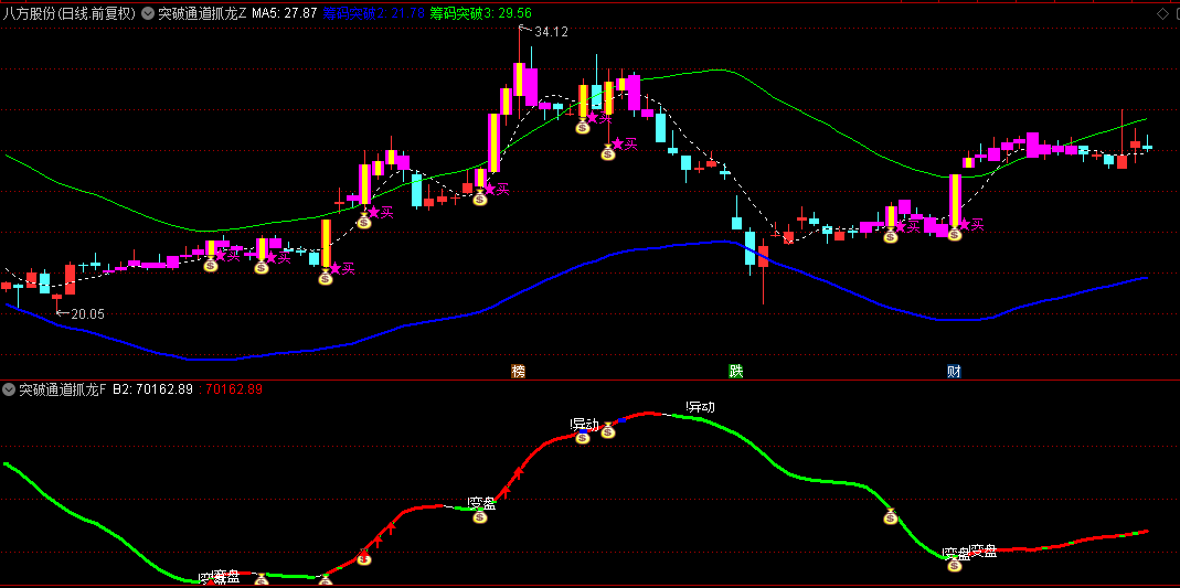 【突破通道抓龙牛】主图/副图/选股指标,识别主力急拉急跌行为,紫色K线标记主力进场!
