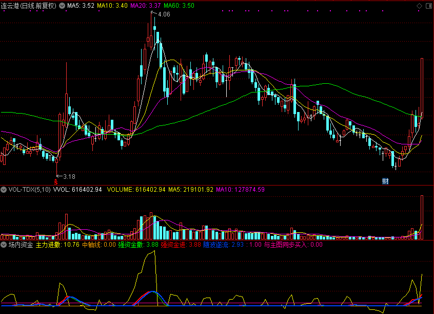 主力进撒:(C-REF(C,涨))/REF(C,涨)*100,COLOR00FFFF,LINETHICK1;