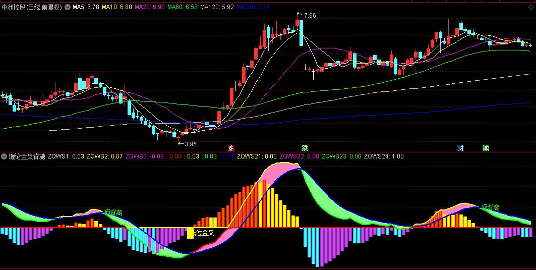 零轴下方:紫红到粉红显示空头减弱,橙黄到明黄警示空头反扑。