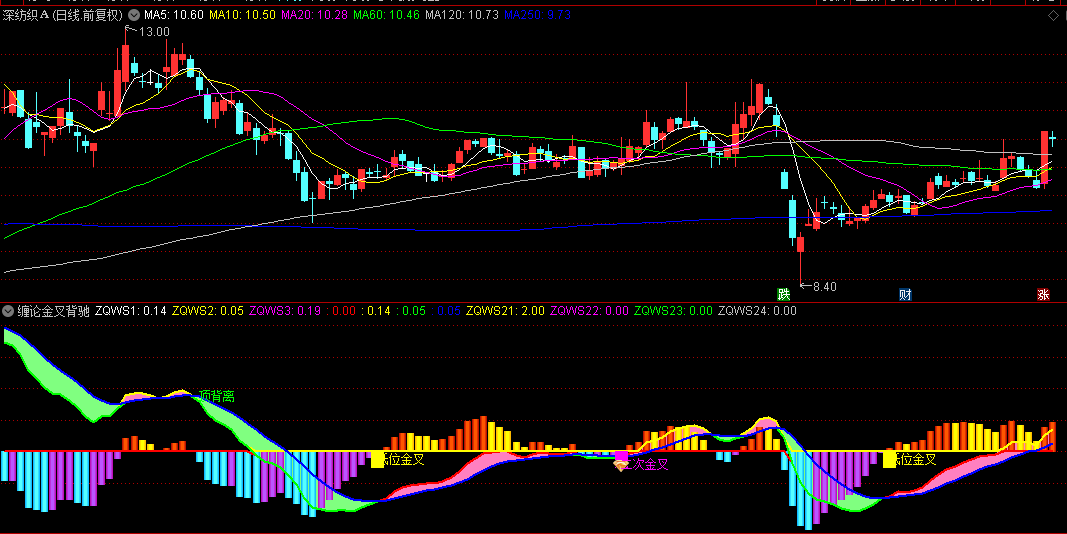 3.缠论实战融合:通过BARSLAST函数精确追踪金叉/死叉周期,结合价格与指标背离验证买卖点,特别设置0.1阈值过滤无效金叉。