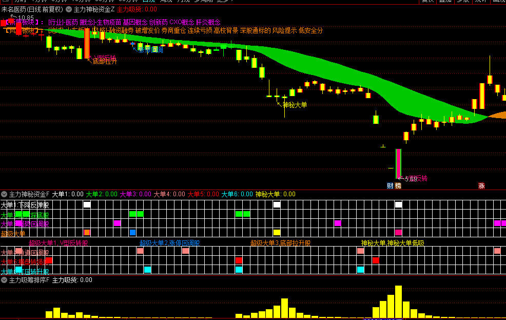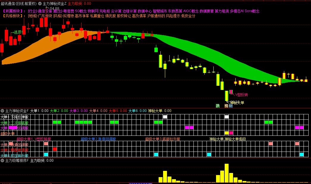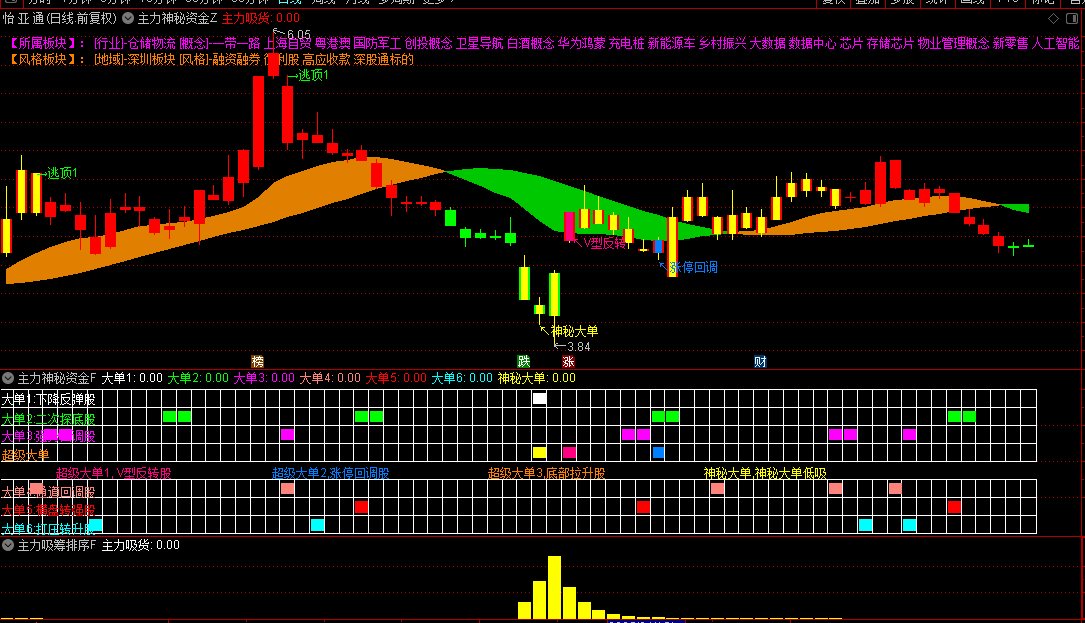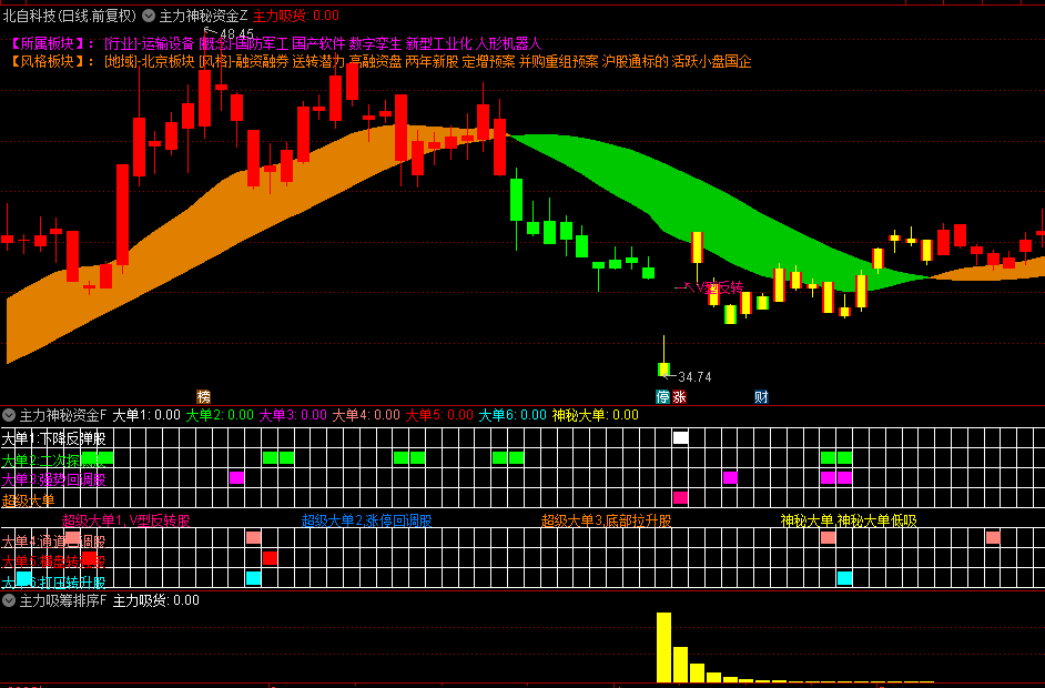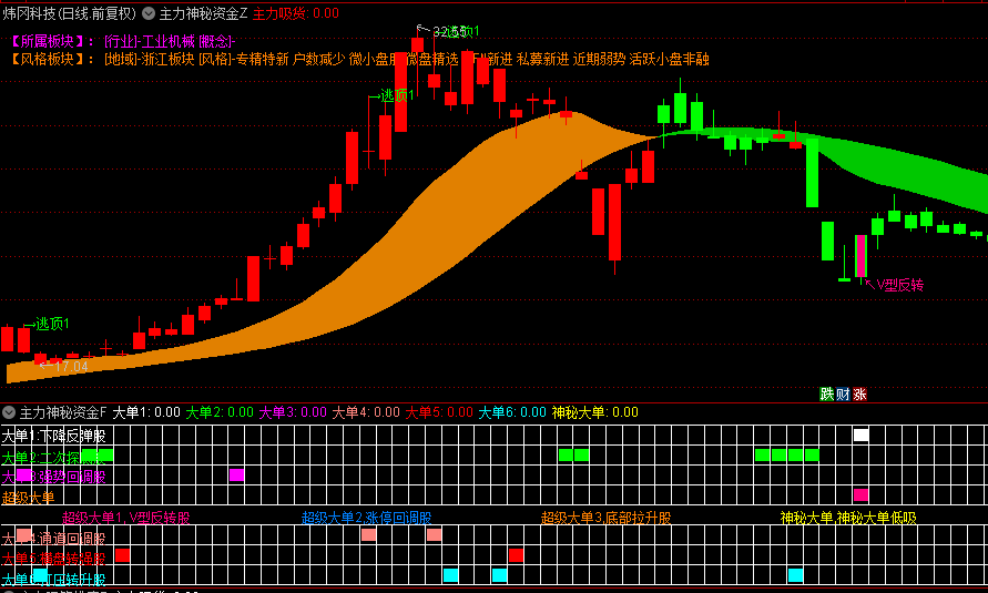 3.超级大单分类:V型反转股(紫色)、涨停回调股(橙色)、底部拉升股(蓝色)、神秘大单(黄色)。
