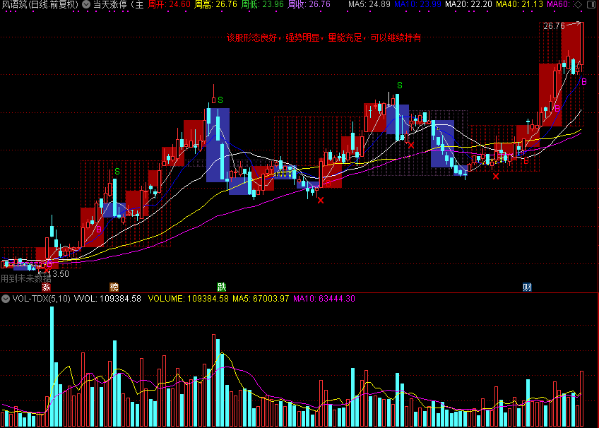 DRAWTEXT(T9=1 AND CURRBARSCOUNT=80,AAA-(AAA*0.03),'该股形态良好,强势明显,量能充足,可以继续持有'),COLORRED ;