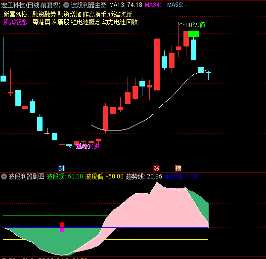 【波段利器】主图/副图套装指标,主图出现波段启动观察介入,副图红色量柱出现代表波段见底!