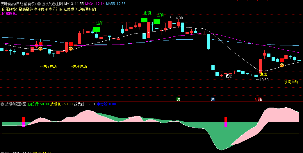 1、主图出现波段启动观察介入,出现逃顶卖出。