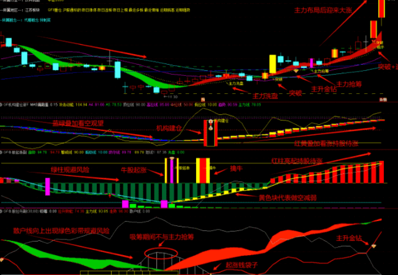 红黄双色叠加预示上涨,蓝绿组合提示下跌(经多年实战验证的波段交易法则)。