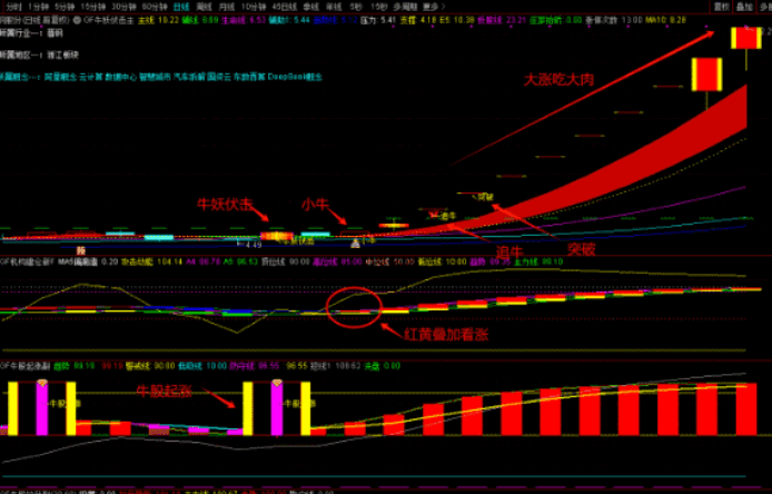"小牛"信号:当生命线位于辅助1线上方且红色彩带初现时触发,预示短期强势。
