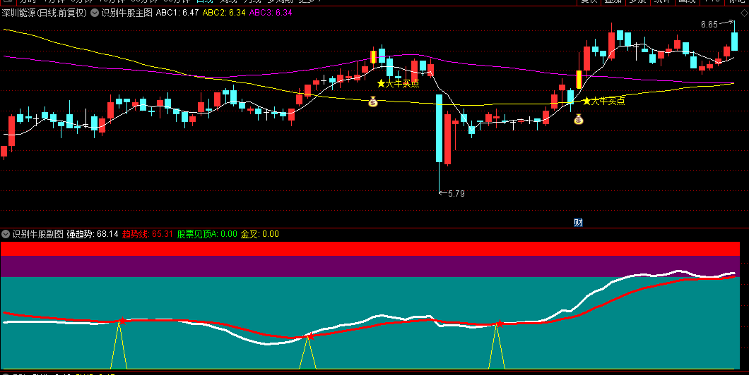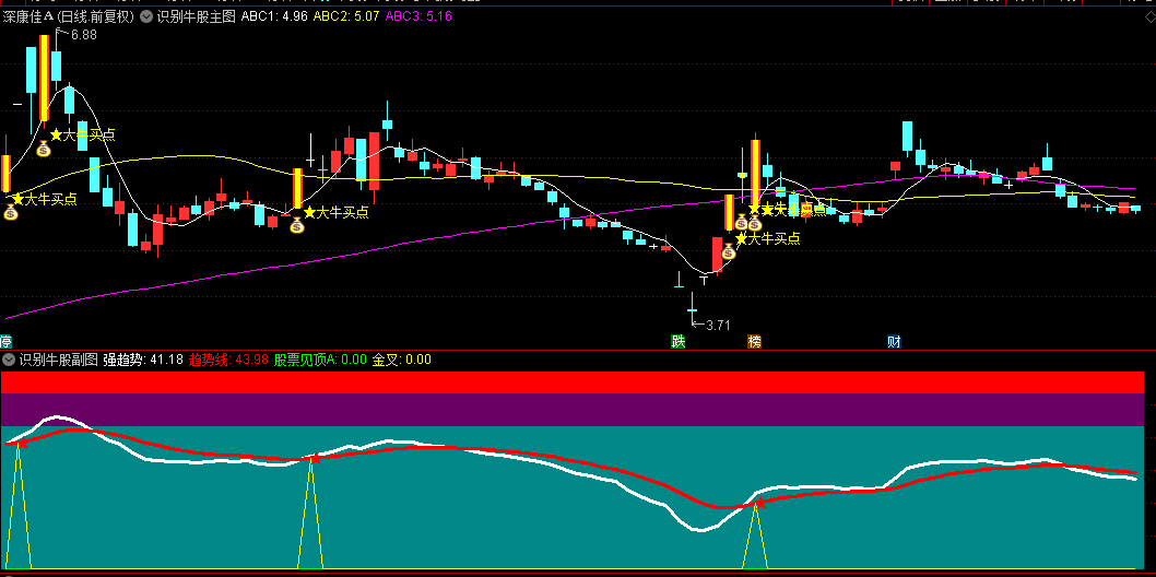 当满足条件时,主图会显示黄色K线、黄色"★大牛买点"文字提示和底部图标标记。
