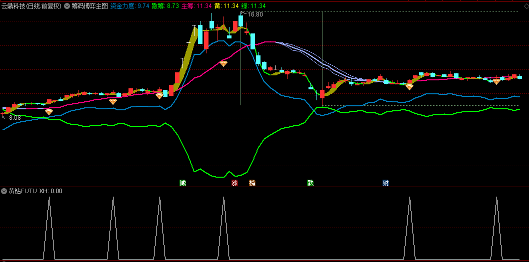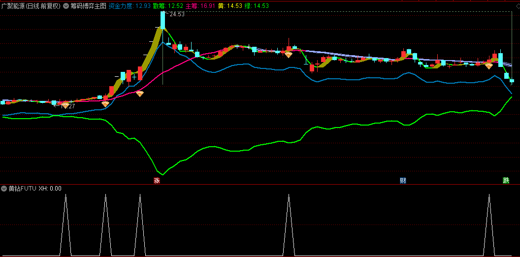 本套技术指标系统整合了三大关键要素:高低趋势线、资金强度指标以及散筹/主筹动态线。