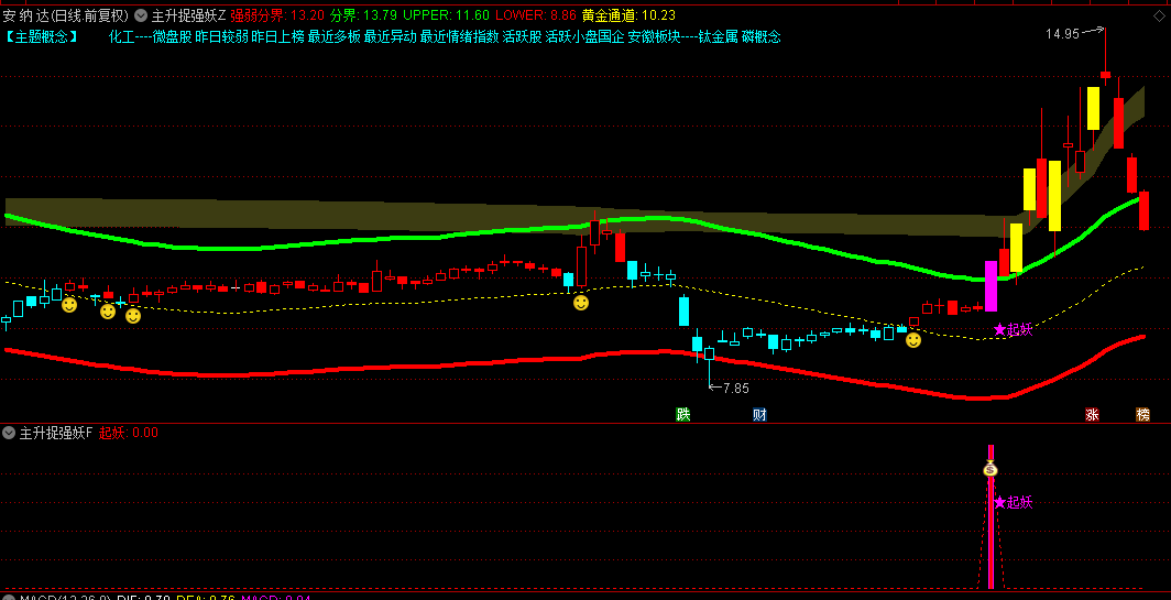 通达信【主升捉强妖】主图/副图/选股指标,有效突破筹码密集区,强势突破黄金通道上轨抓妖!