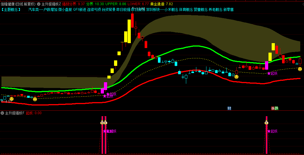 2.协同验证信号:主图出现"起妖"标志,副图同步显示"钱袋子起妖"信号,此双信号共振为最佳买入时机。