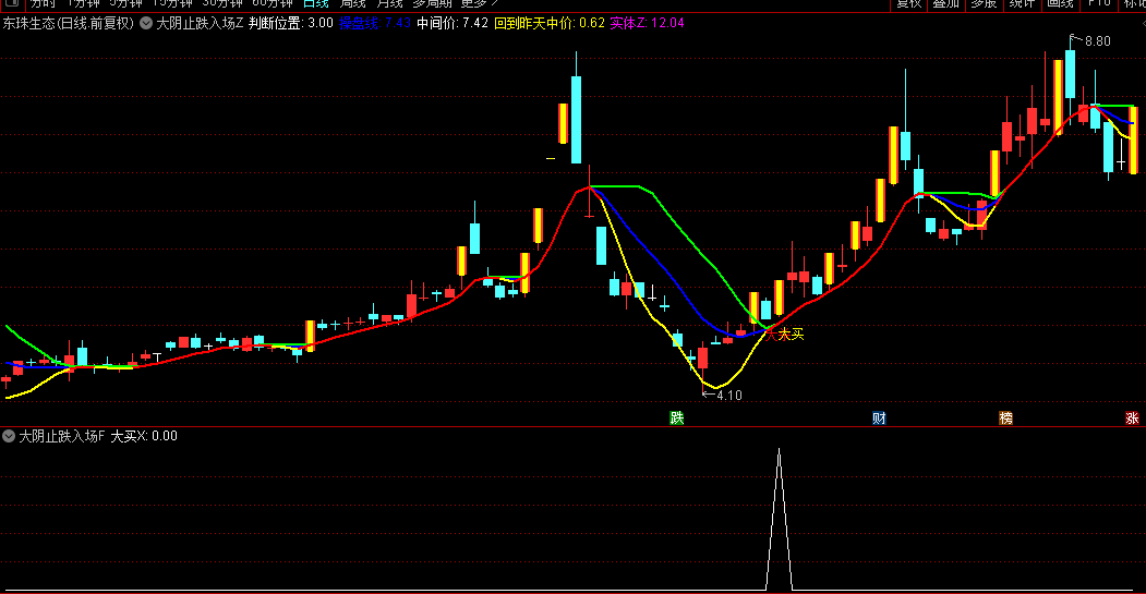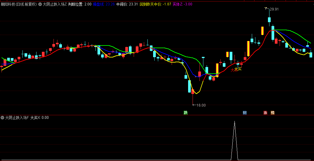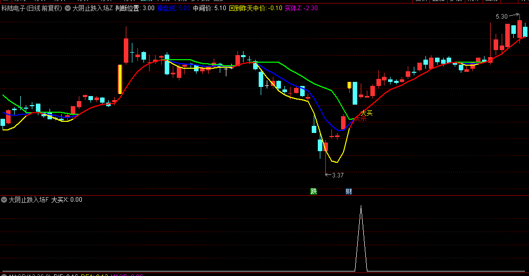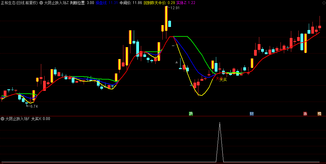 系统将在副图标记"大买"信号,此时突破蓝色操盘线即为入场时机。