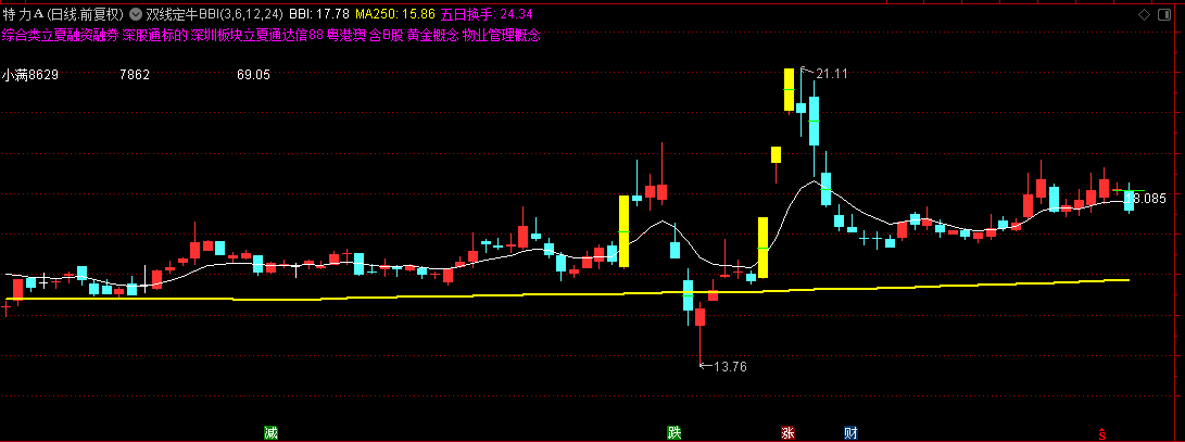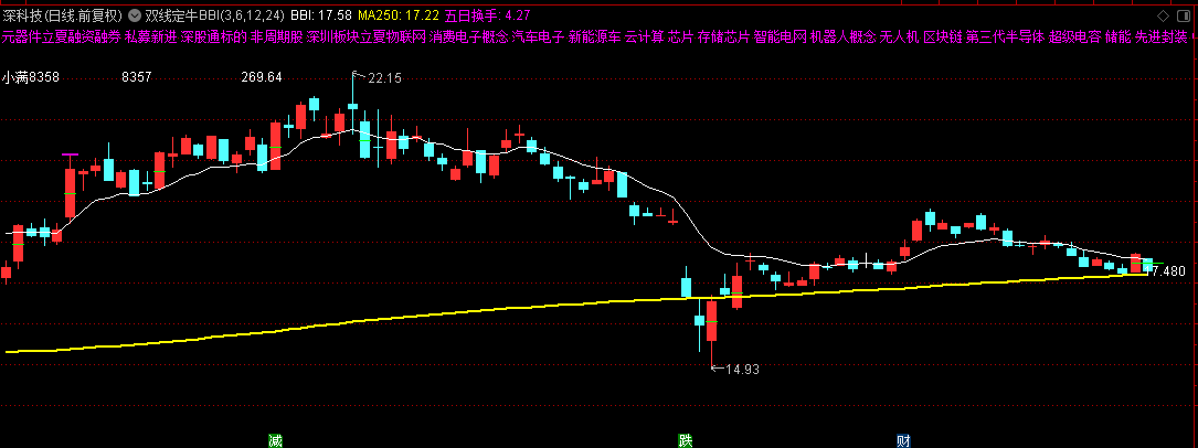 图中只有2条均线;一条是年线250日均线;另外一条就是自制BBI均线;