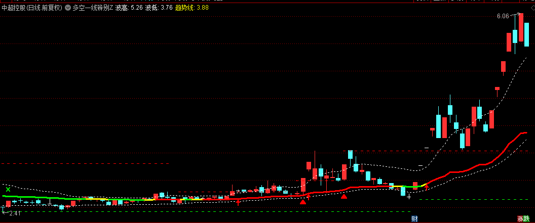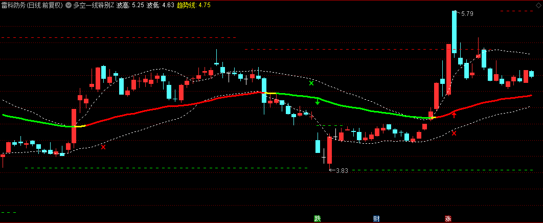 【多空一线辨别】主图指标,白色虚线标注波动上轨和下轨,当趋势线持续变色时顺势操作!