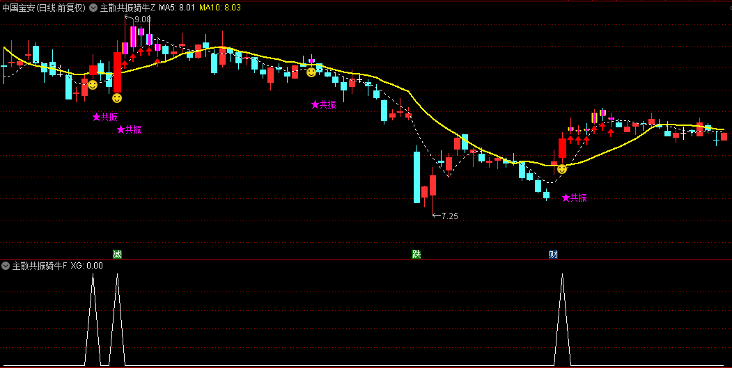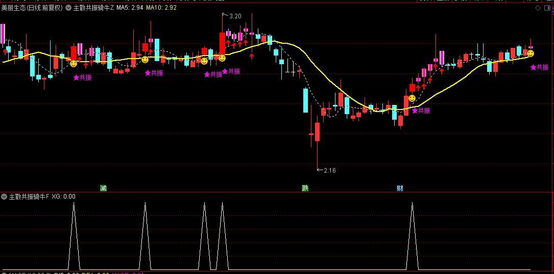 1.主图标志信号:黄色实体K线叠加紫色边框构成"骑牛形态",低位五星图标配合"★共振"文字提示,红色放量K线标记二次启动买点。