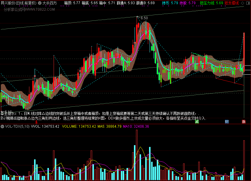 DRAWTEXT_FIX(ISLASTBAR,0,0.98,0,'2、视降△边和涨△边为三角形两边线,选三角形整理将结束的K图,DDX做多强烈,上攻成交量必须放大,各指标呈买点金叉时介入.'),COLORWHITE;
